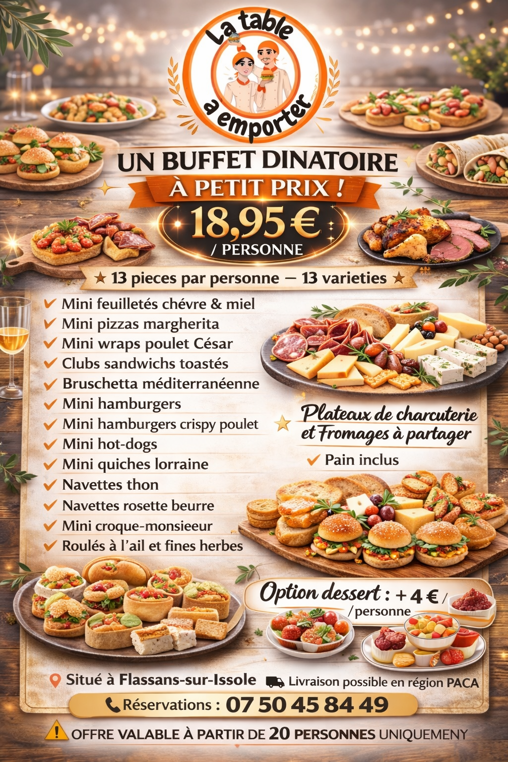 Conditions : livraison possible selon secteur (en supplément), menu identique pour l’ensemble des convives.